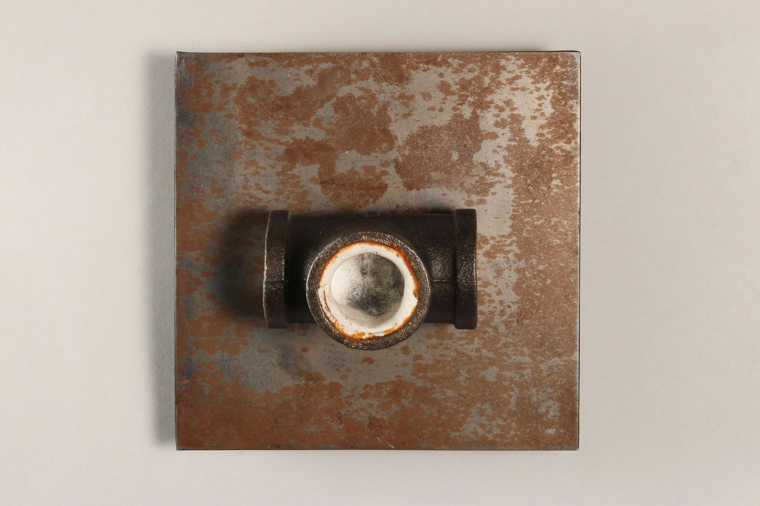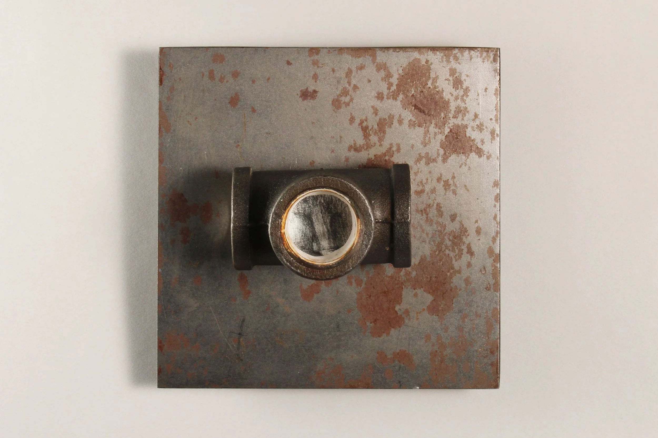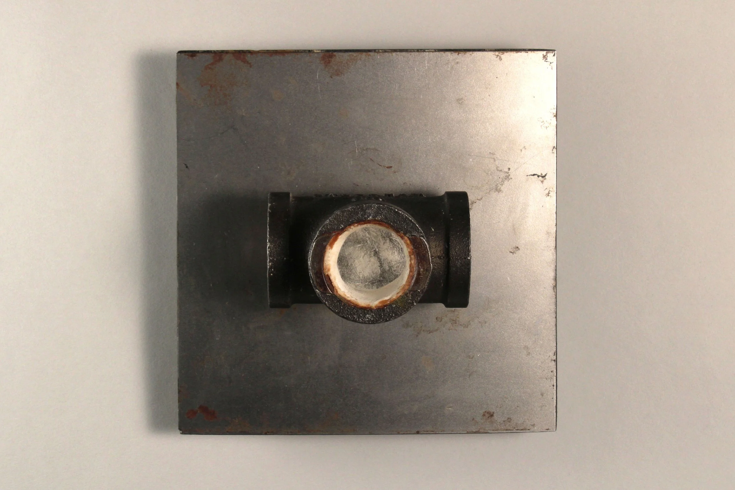 Graphite on plaster, commercial plumbing pipe, steel plate with wood backing